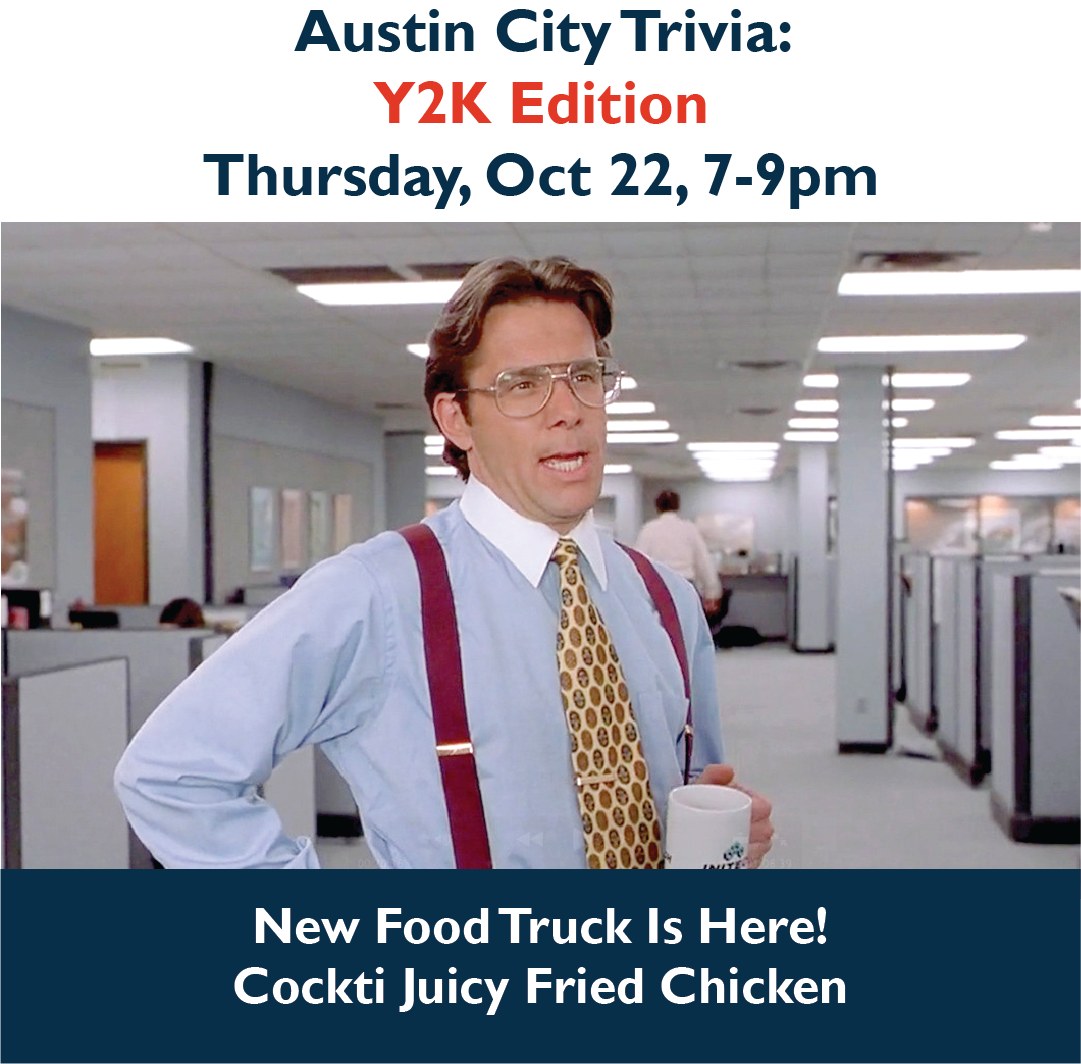 3913 Todd Ln, Ste 607, Austin, TX, United States, Texas 78744Y2K Trivia Night at Independence Brewing Co. Grab your flip phone, frost those tips, and flex your pop-culture memory! We’re throwing it way back to the era of AIM away messages, boy bands, and questionable denim choices. Think you can still name all the Spice Girls, or remember what a Zune was? Prove it. Free […]
